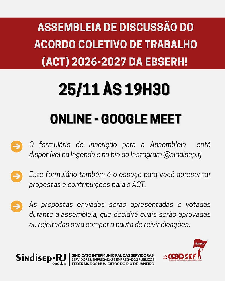 O Sindisep-RJ convoca todas as trabalhadoras e trabalhadores da EBSERH para participarem da Assembleia de Discussão do Acordo Coletivo de Trabalho (ACT) 2026-2027, que será realizada na terça-feira, dia 25 de novembro, às 19h30, de forma online pelo Google Meet.